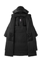 Lange parka met een moderne uitstraling. Recht model. Voorzien van een gewatteerde capuchon en een stevige ritssluiting aan de voorkant. Twee schuine steekzakken met ritssluiting. Het iconische logobadge op de mouw. Binnenzakken voor extra opslag. De jas heeft elastische manchetten voor een nauwsluitende pasvorm.