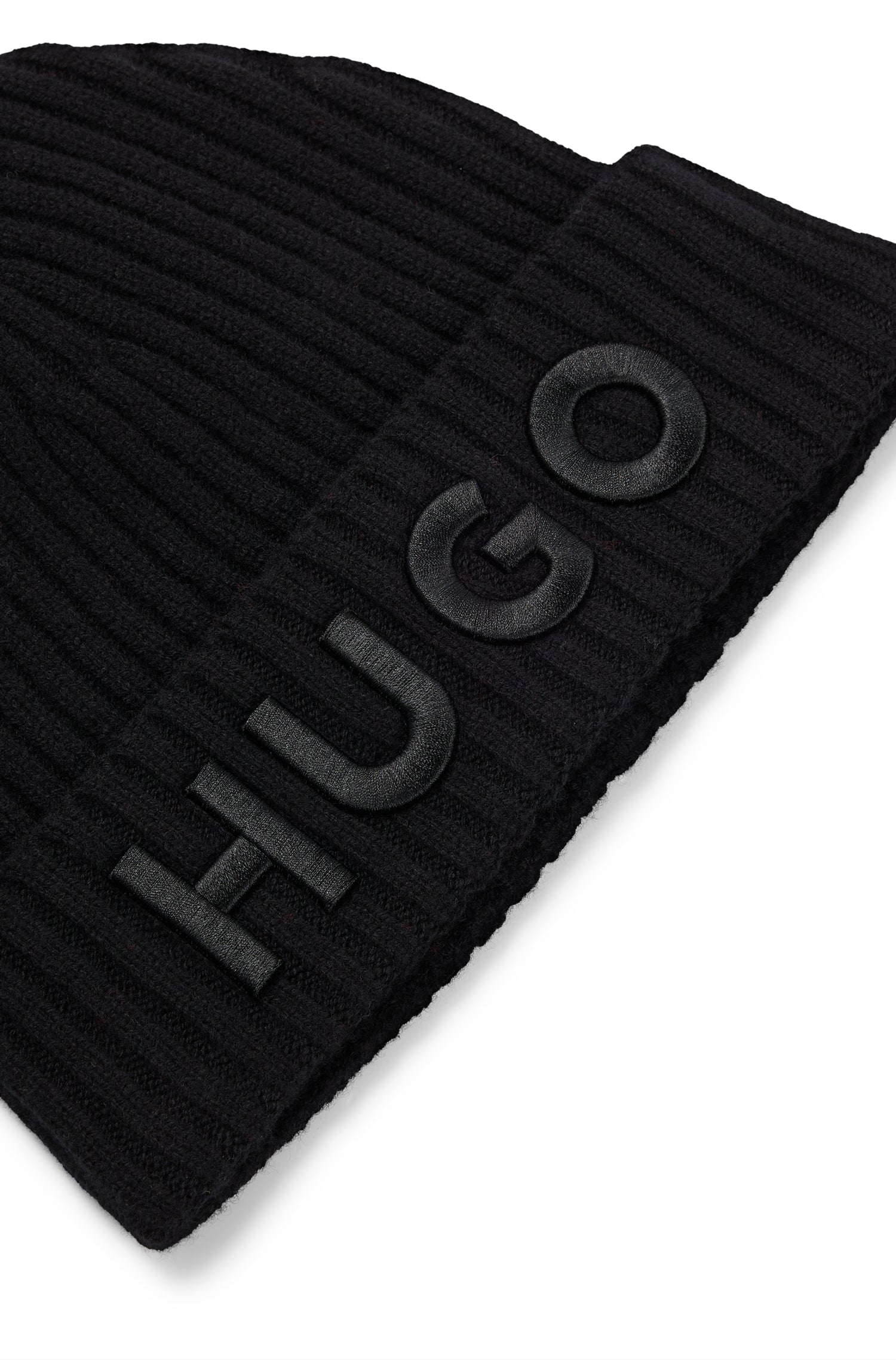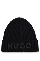 Zwarte muts met een ribgebreide structuur. Voorzien van een opvallend, groot HUGO-logo op de omgeslagen rand. One size ontwerp dat naadloos aansluit voor dagelijks gebruik. Een essentieel accessoire voor elk seizoen.