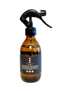 Interieur roomspray. Flacon met zwarte spuitkop voor eenvoudige applicatie. Minimalistisch design met merklogo voorzijde. Helder bruine fles met inhoud van 250 ml.