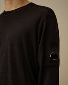 De trui heeft een rechte pasvorm (Regular Fit). De afwerking bestaat uit ribgebreide boorden, manchetten en een ribkraag. Het meest kenmerkende detail is de functionele utility pocket op de linkerarm. Deze mouwzak is voorzien van het iconische, ronde C.P. Company lens detail, wat het karakter van het merk benadrukt.