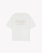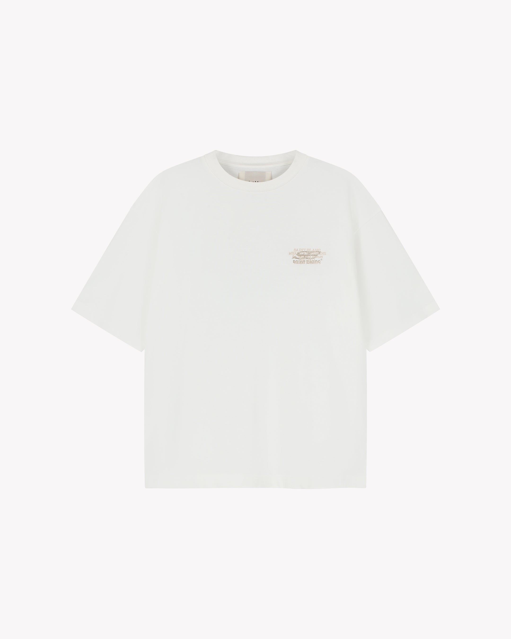 T-shirt van het merk SAINT BLANC in een wit ontwerp. Het T-shirt heeft een klassieke ronde halslijn en korte mouwen. Op de borst bevindt zich een subtiele opdruk van het merk. De achterkant van het T-shirt bevat een grotere opdruk met de tekst "SAINT BLANC MERCHANDISE LINE for men and woman, EST. 2022 © SAINT BLANC". Het ontwerp straalt eenvoud en moderniteit uit. Geschikt voor diverse casual gelegenheden en makkelijk te combineren met verschillende stijlen.