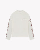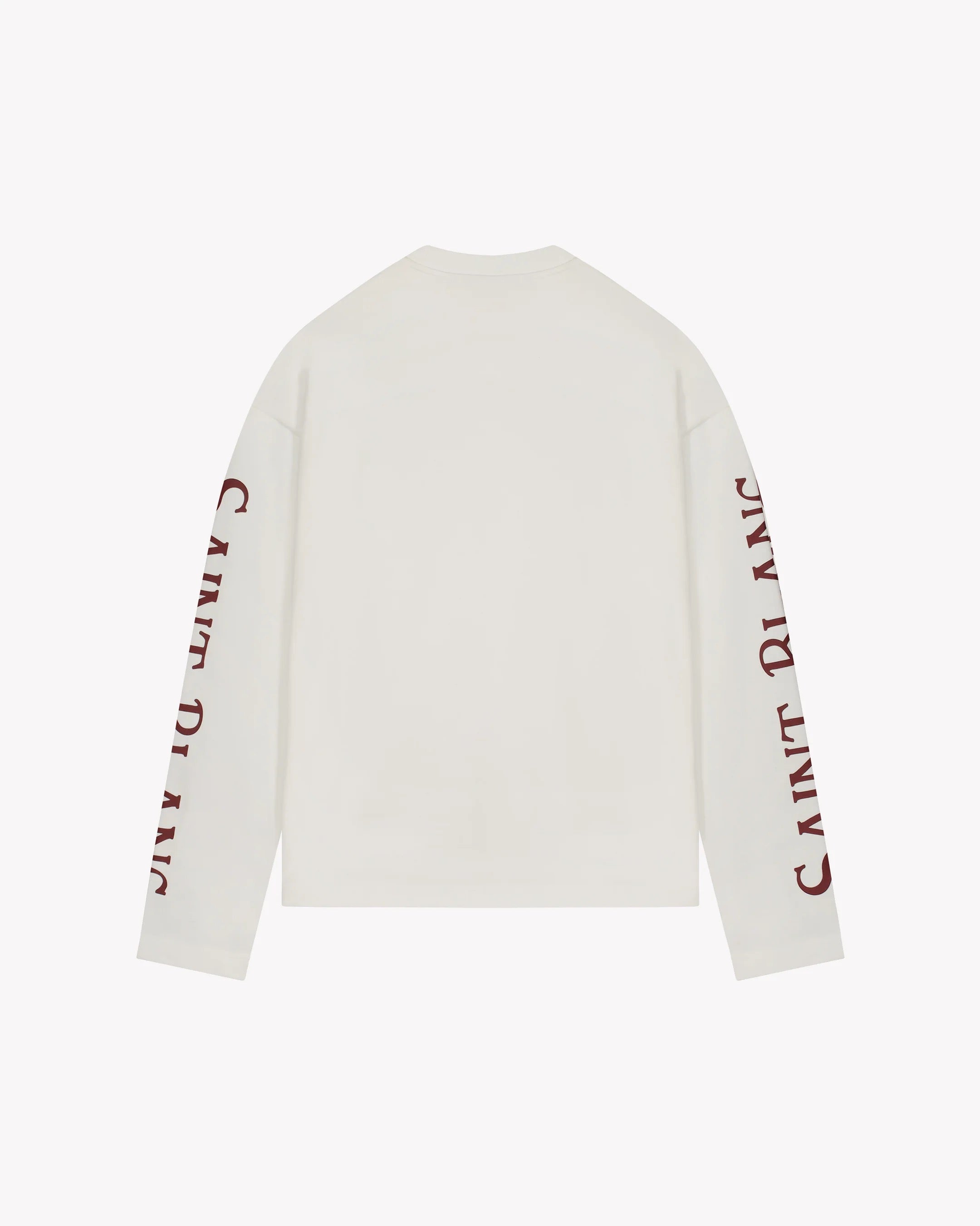De Saint Blanc T-SHIRT WHISPER LONG SHIRT WIT voor heren van Saint Blanc heeft een helder witte basiskleur met een sterke grafische uitstraling. Dit long shirt heeft een opvallend ontwerp door bordeauxrode belettering op de borst, waar de merknaam subtiel in het klein wordt weergegeven. Voor extra impact is de merknaam tevens in een grote, verticale opdruk over de gehele lengte van beide mouwen gedrukt.