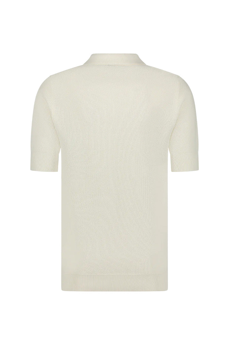 Stijlvolle polo met korte mouwen en een klassieke kraag. Drieknoopssluiting aan de voorkant. Ribboorden aan de mouwen en zoom. Zachte en lichte stof voor optimale luchtigheid. Tijdloze off-white kleur. Delicaat geweven structuur die subtiel patroon creëert. Klein merklogo subtiel verwerkt aan de binnenkant van de kraag.