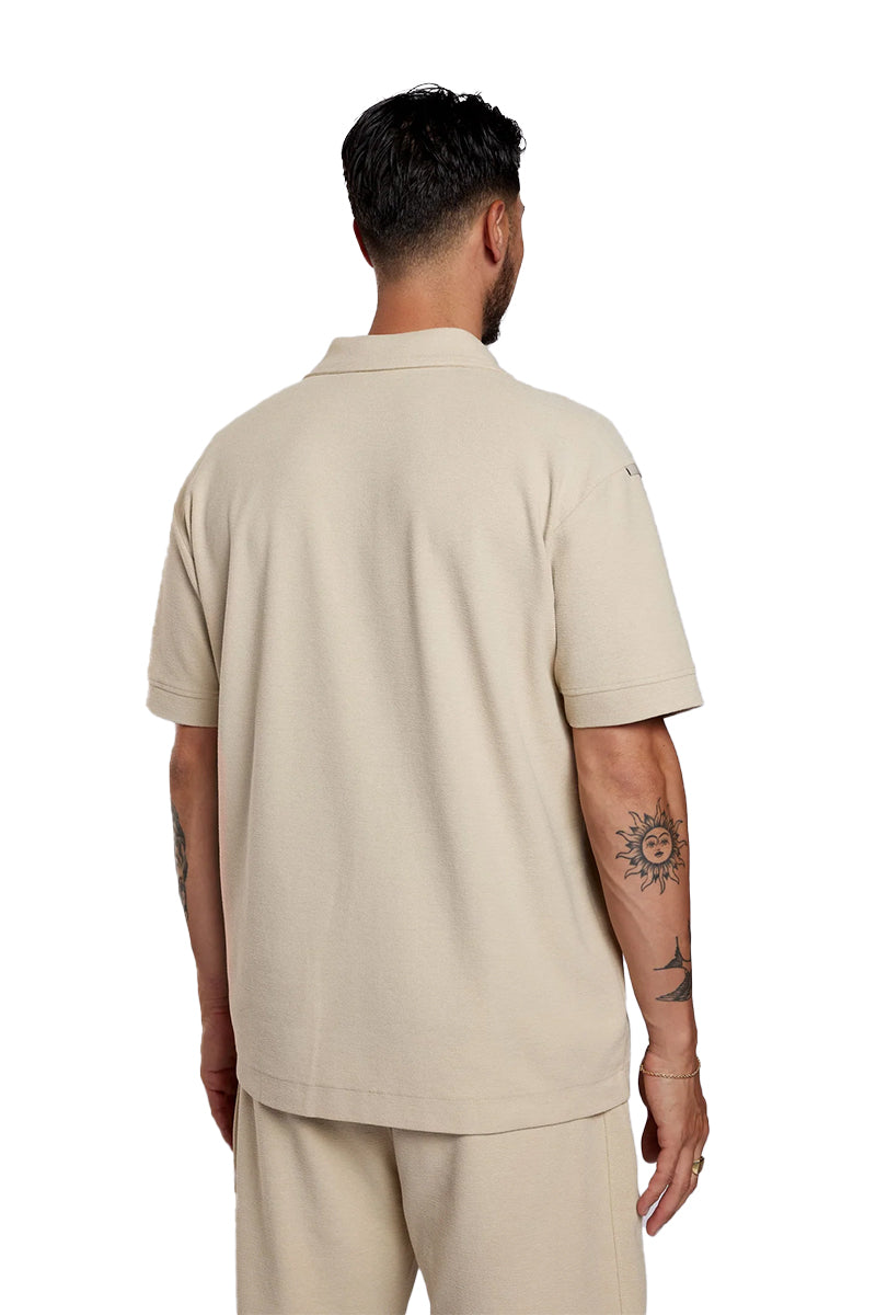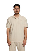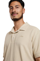 Klassieke polo met een traditionele kraag en drieknoopsluiting. Voorzien van korte mouwen en een rechtvallende pasvorm. Subtiel geborduurd merklogo op de borst. De lichte beige kleur geeft het kledingstuk een tijdloze uitstraling, ideaal om te combineren met diverse outfits. Bekijk de foto's voor een compleet beeld van de details.