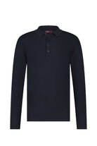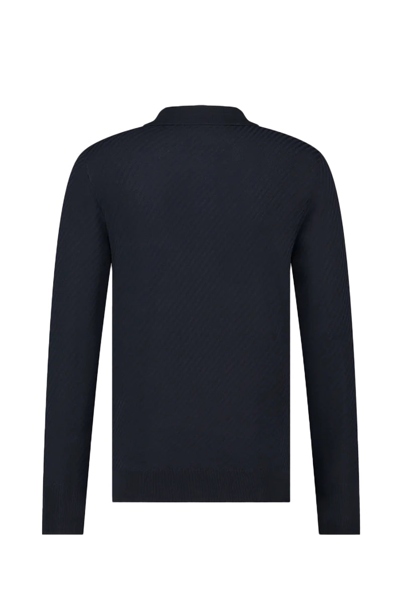 Trui met klassieke polokraag en knoopsluiting, ontworpen voor diverse gelegenheden. Voorzien van lange mouwen en een ribgebreide afwerking aan de uiteinden van de mouwen en de zoom. Het subtiele streeppatroon zorgt voor een verfijnd uiterlijk. De trui komt in een donkerblauwe kleur. Bekijk de foto's voor details over opdruk en dessin.