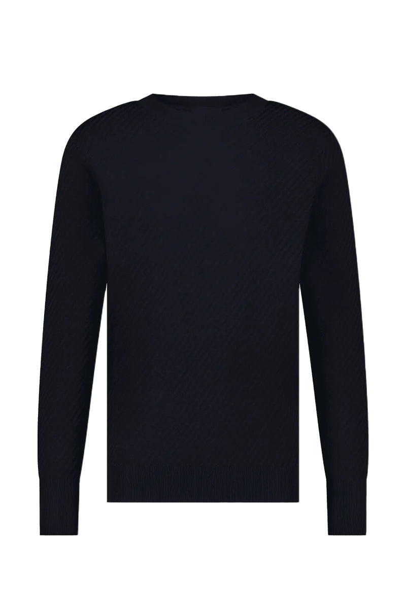 Trui met ronde hals in opvallend donkerblauw. Standaard pasvorm. Ribgebreide boorden aan de mouwen en zoom. Het subtiele AEDEN-logo is geborduurd op de voorkant. Geschikt voor verschillende gelegenheden.
