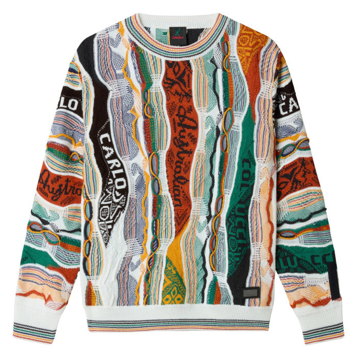 Trui van Carlo Colucci met een opvallend design in diverse kleuren. De trui valt op door zijn complexe patronen en rijke kleurenpalet, waaronder groen, oranje en geel. De ronde hals en lange mouwen zorgen voor een klassieke pasvorm. Het gebreide logo is op meerdere plekken geïntegreerd in het ontwerp, wat een unieke uitstraling geeft. Deze veelzijdige trui is geschikt voor verschillende gelegenheden.