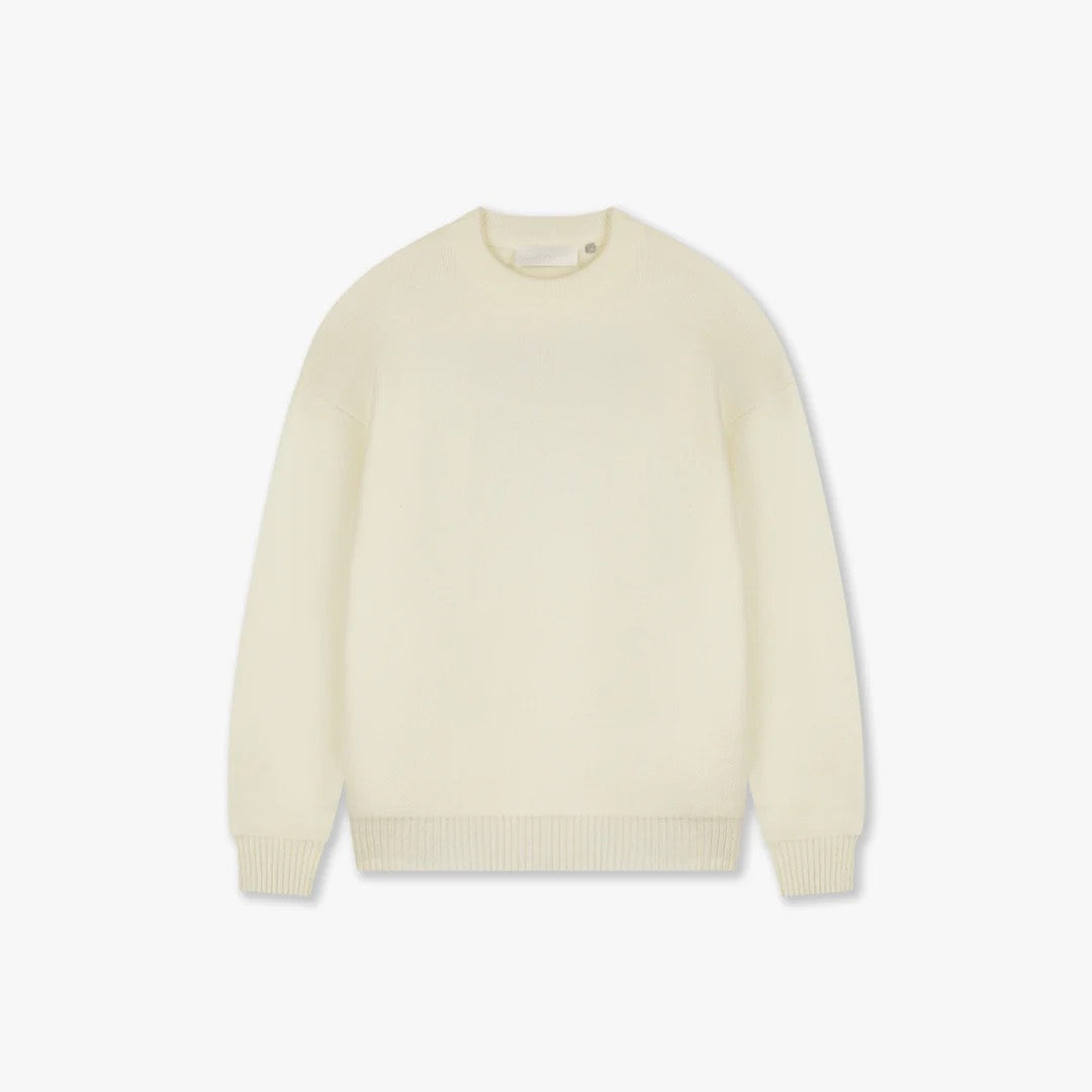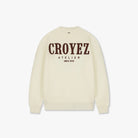 De CROYEZ TRUI GALLERY KNIT SWEATER WIT van het merk Croyez heeft een luxe uitstraling door de crèmekleurige, grof gebreide structuur. Het meest prominente detail is het grote, geborduurde logo 'CROYEZ ATELIER SINCE 2019' in een contrasterende bordeaux kleur op de rug.