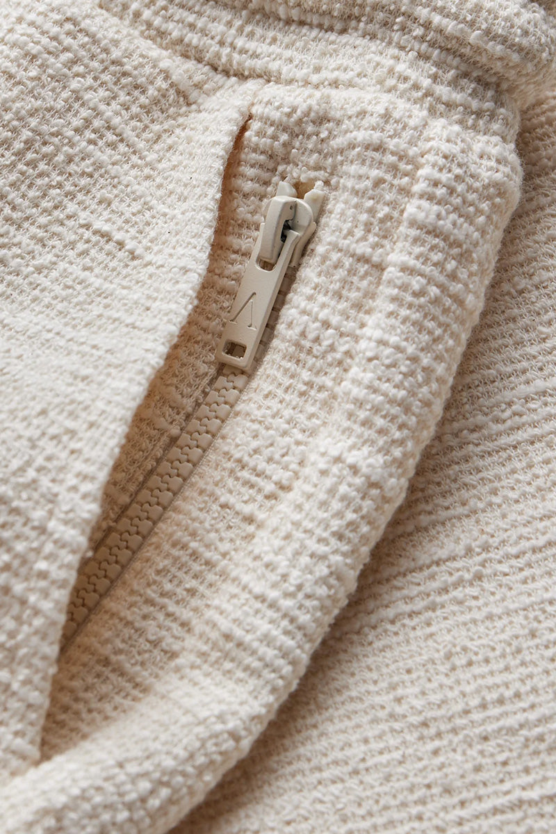 Korte broek van AEDEN met een casual pasvorm. Voorzien van elastische tailleband met trekkoord. Twee zijzakken met ritssluiting. Geborduurd logo op de linkerpijp. Gehele ontwerp in subtiele off-white kleur.