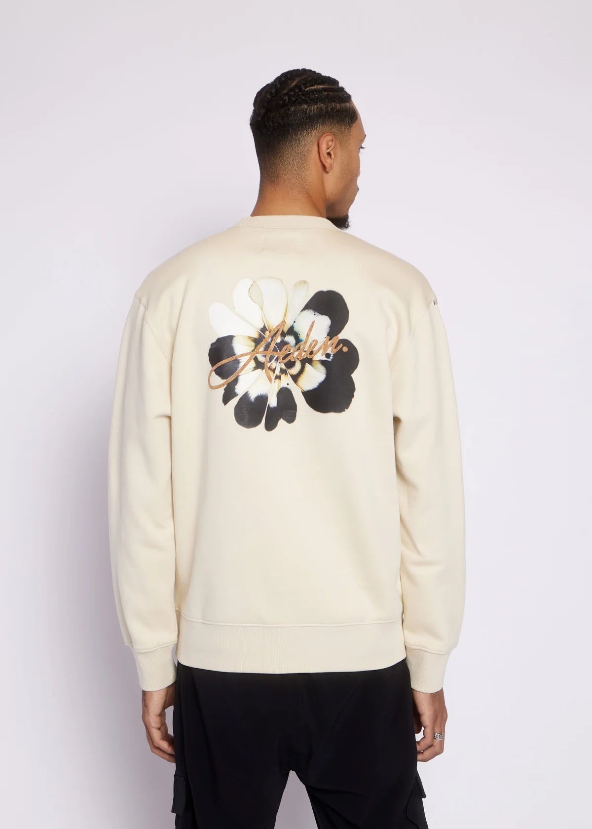 Sweater van AEDEN in zand-khaky tint met een standaard pasvorm. Ronde halslijn. Voorzien van een opvallende bloemenprint op de achterkant met het merklogo in script. Ribgebreide boorden aan de mouwen en zoom. Klein logo op de borst.