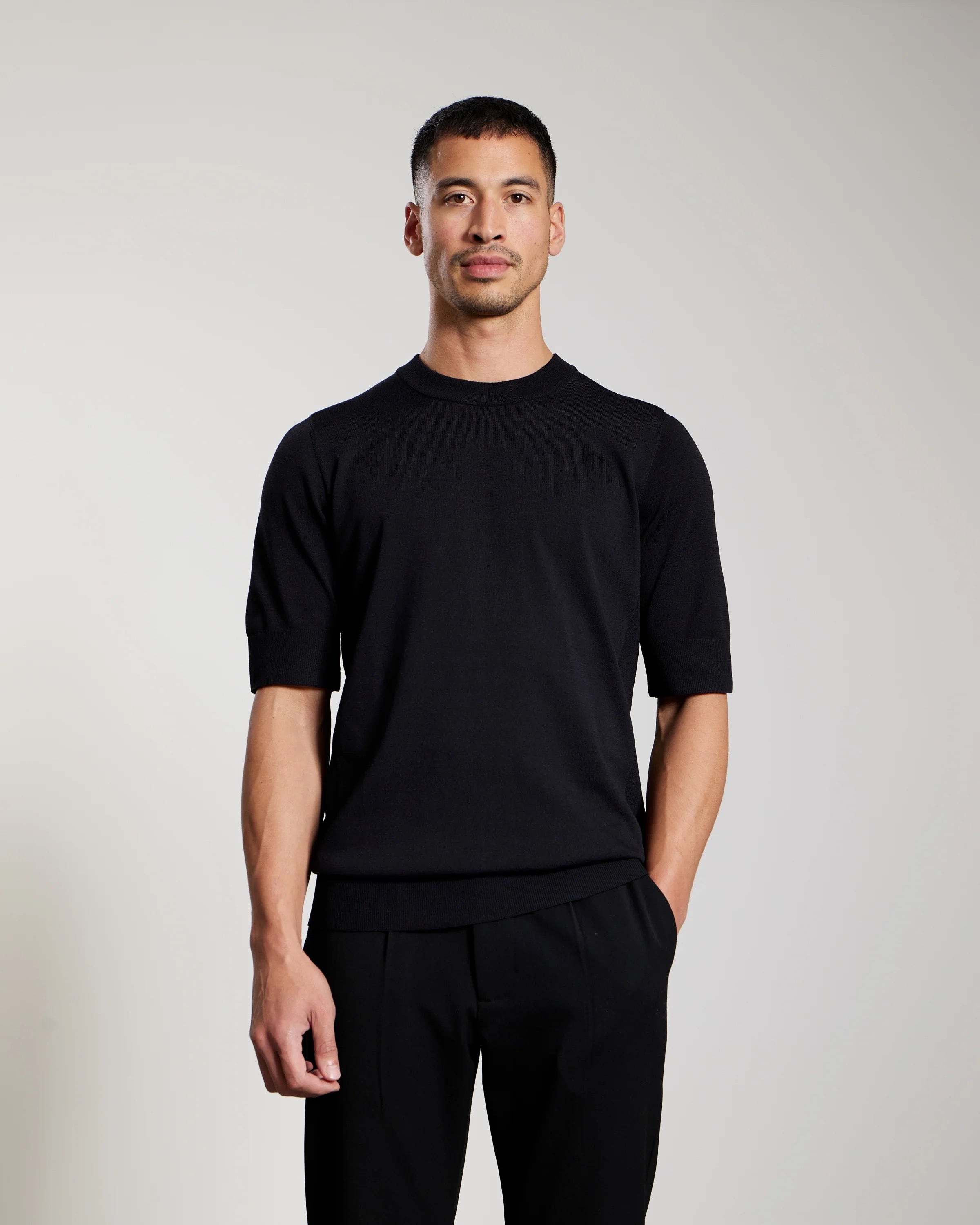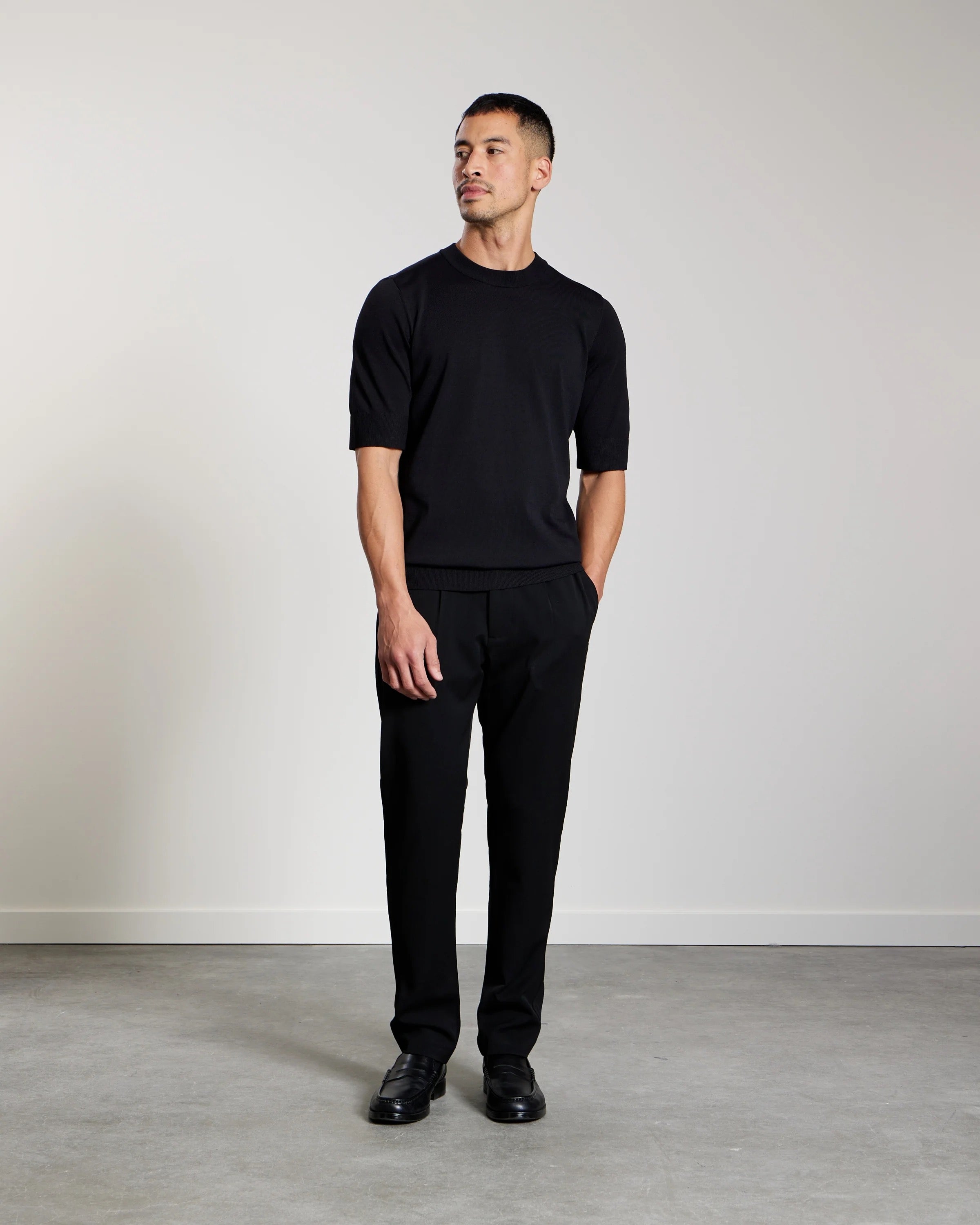 Het AEDEN T-SHIRT NATHANOS ZWART van Aeden is een essentieel item voor de moderne heer. Dit t-shirt heeft een diepzwarte kleur en een minimalistisch ontwerp dat moeiteloos gecombineerd kan worden. Een bijzonder detail is de verticale naad die over het midden van de rug loopt, wat het kledingstuk een verfijnde uitstraling geeft. De gebreide structuur zorgt voor een luxe uitstraling die zowel zakelijk als informeel gedragen kan worden.