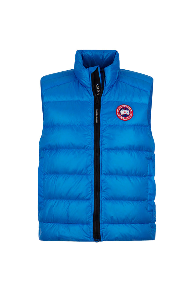 Packable Crofton bodywarmer voor heren, in kleur 1265 Glacier Blue, van het merk Canada Goose. Een lichtgewicht, comfortabele slim-fit bodywarmer, die makkelijk kan worden opgeborgen in de binnenzak om mee te nemen op reis of voor de warme zomerdagen. Een duurzame, ultralichte stof met ripstop-constructie is ontworpen om harde wind, lichte regen en sneeuw te weerstaan. Gemaakt van 100% gerecycled nylon met een waterafstotende afwerking, blijft droog en comfortabel bij onvoorspelbaar weer.