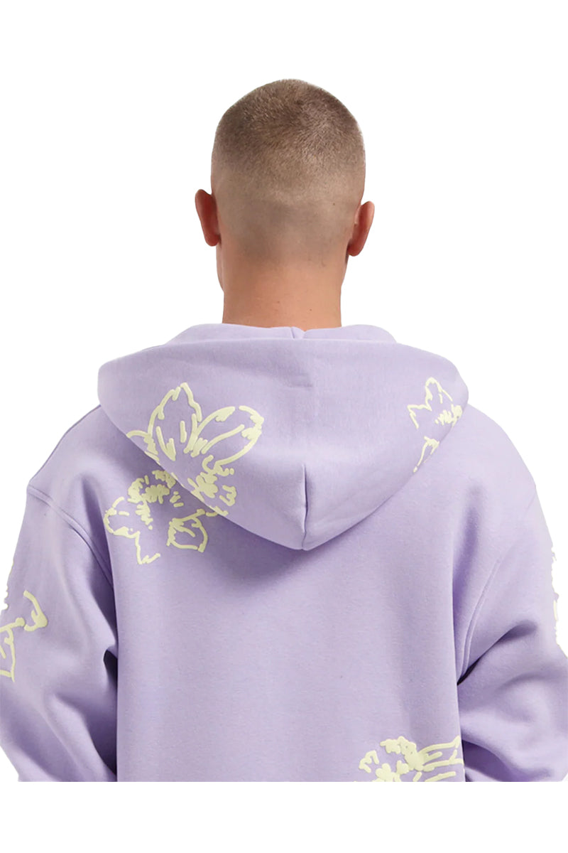 Paarse zip-hoodie met bloemenprint. De hoodie heeft een standaard pasvorm en is voorzien van een volledige ritssluiting aan de voorzijde. De opdruk bestaat uit gebloemde motieven en het subtiele merklogo op de borst. De capuchon is gevoerd en heeft geen koord, wat zorgt voor een strakke uitstraling. Ribboorden zijn toegevoegd aan de mouwen en zoom voor een nette afwerking.