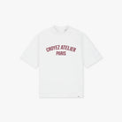 Het CROYEZ T-SHIRT CROYEZ RAGLAN T-SHIRT OFF WHITE is een kenmerkend kledingstuk uit de collectie van Croyez. Dit T-shirt in een heldere off-white kleur valt op door het sportieve ontwerp met raglanmouwen en een licht opstaande, ronde hals. De merkidentiteit is prominent aanwezig middels een bordeauxkleurige boogprint op de borst, waarop de tekst "CROYEZ ATELIER PARIS" staat vermeld.