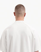 De pasvorm van dit T-shirt is ruim en oversized, uitgevoerd in een modern boxy model met brede, korte mouwen. De afwerking is verzorgd door duidelijke stiklijnen langs de raglanmouwen, wat het sportieve karakter benadrukt. Een subtiel logolabel is aangebracht nabij de linkerzoom aan de onderzijde van het kledingstuk.