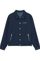 Jas met een eigentijds ontwerp, uitgevoerd in een diepe blauw tint. Voorzien van een nette kraag en drukknopsluiting aan de voorzijde. Twee functionele zijzakken met rits voor praktische opbergruimte. Elastische boorden aan de mouwuiteinden. Op de voorzijde staat subtiel het merklogo, terwijl een grotere opdruk op de achterzijde zichtbaar is. Let op de details en afwerking op de afbeelding. Geschikt voor diverse gelegenheden.