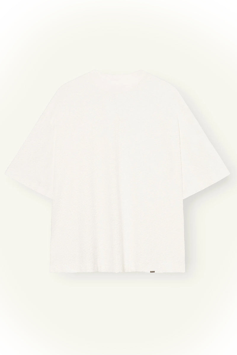 T-shirt met een minimalistische uitstraling en een eenvoudige, rechte pasvorm. Verkrijgbaar in off-white, wat zorgt voor veelzijdige combinatiemogelijkheden. Voorzien van een ronde halslijn en korte mouwen. Subtiel logo van het merk aangebracht aan de onderkant. De neutrale kleur maakt het geschikt voor diverse gelegenheden.