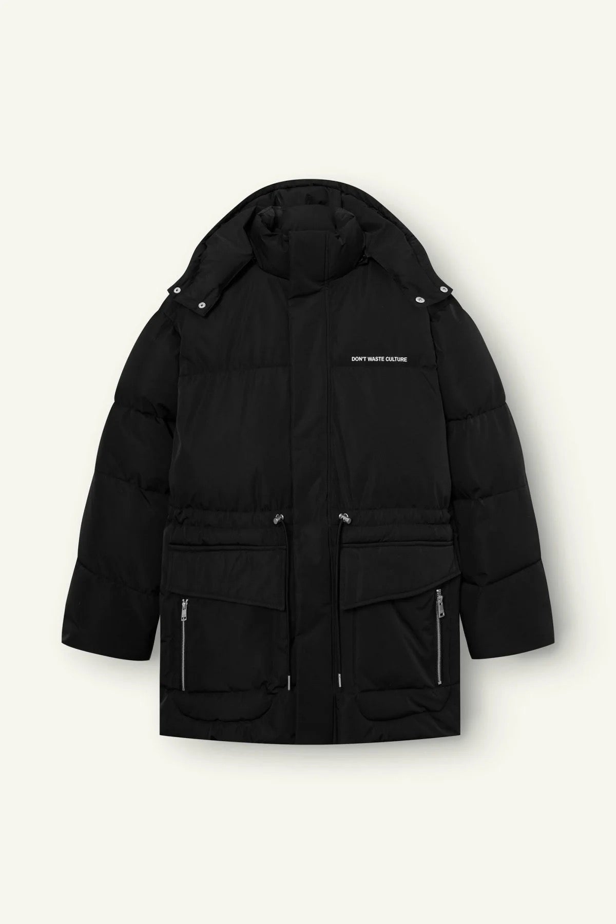 De DONT WASTE CULTURE JAS BRISKA ZWART is een kenmerkend gewatteerd UNISEX jack van DONT WASTE CULTURE. Het ontwerp kenmerkt zich door de robuuste, volumineuze puffer-uitvoering in diepzwart. Dit model is uitgerust met een royale, vaste capuchon en een hoge kraag, wat zorgt voor optimale bescherming tegen de elementen. Aan de voorzijde, ter hoogte van de borst, is het subtiele, witte merklogo geplaatst.