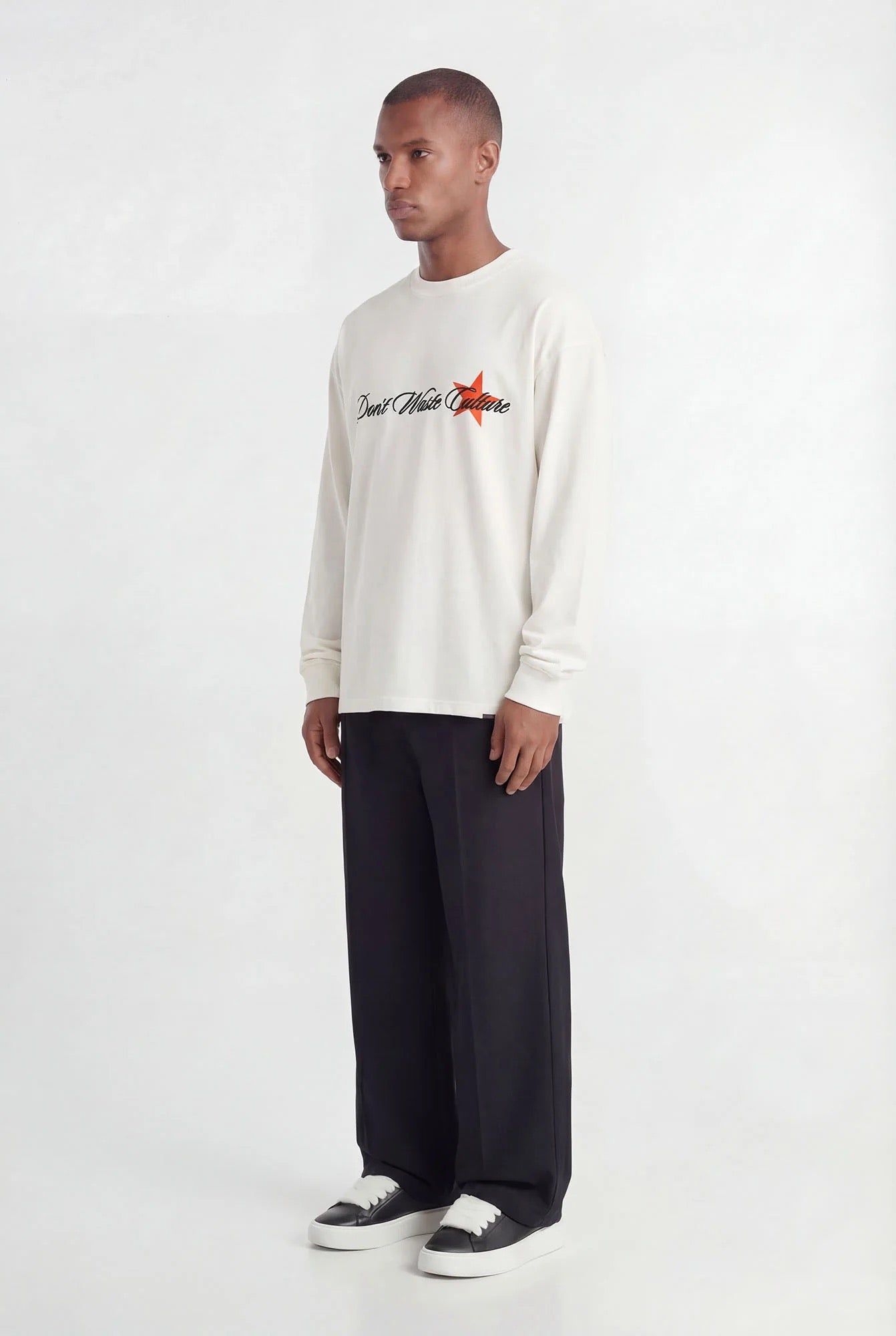 Het DONT WASTE CULTURE T-SHIRT UNISA OFF WHITE is een veelzijdig kledingstuk van het merk Dont Waste Culture. Dit unisex longsleeve shirt kenmerkt zich door een effen off-white basis. Het ontwerp wordt gedefinieerd door de grafische opdruk op de borst, bestaande uit de gebogen, zwarte merknaam en een opvallende rode ster. Dit geeft het shirt een eigentijdse en herkenbare uitstraling.