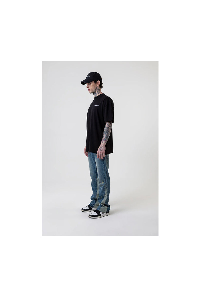 Rechtvallende jeans met een subtiele flare. Blauw denim met een authentieke versleten look. Details zoals verfspetters en gerafelde zoom geven deze broek een unieke uitstraling. Voorzien van klassieke vijf-pocket design en een knoop- en ritssluiting. Het logo is geïntegreerd op de achterzak.
