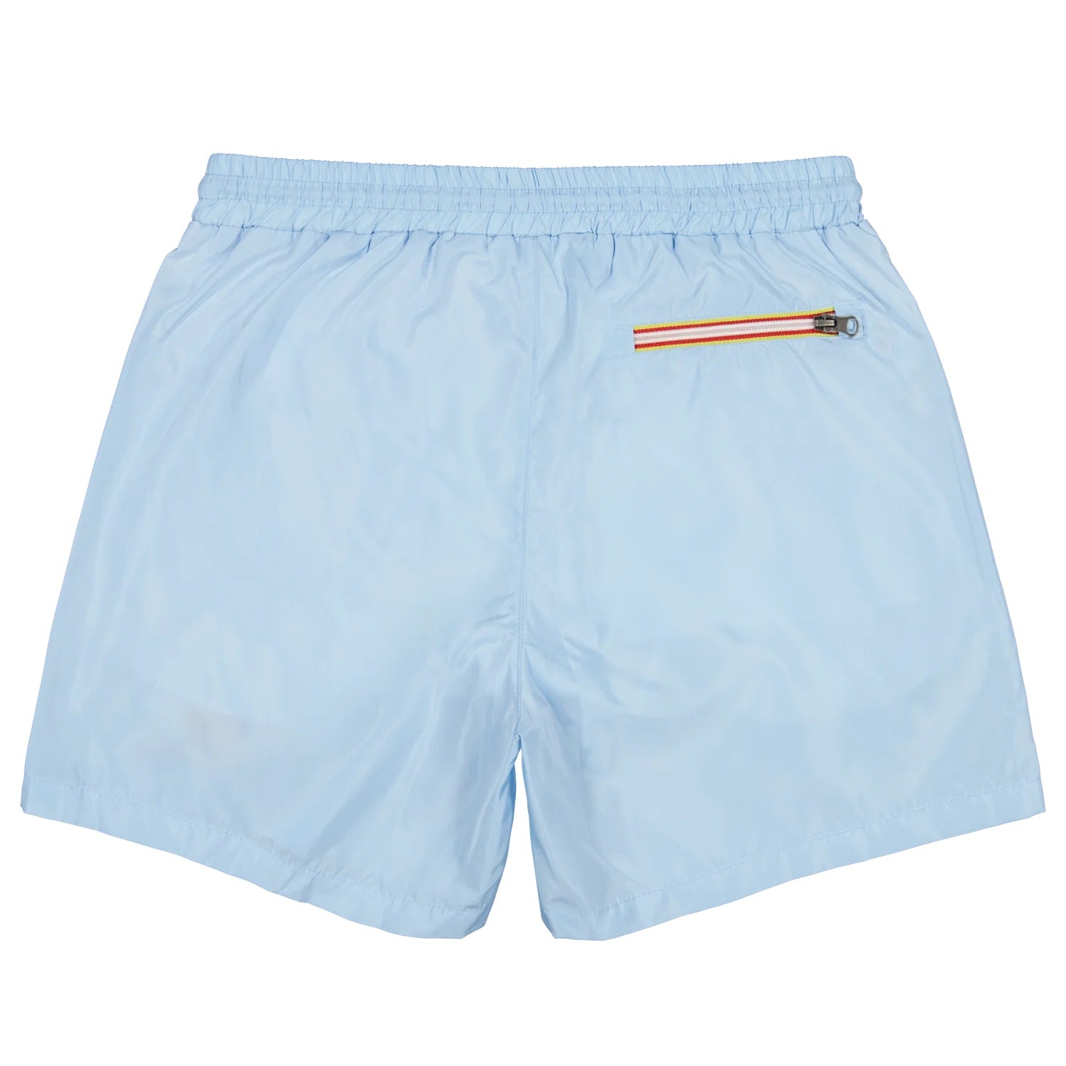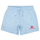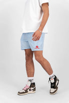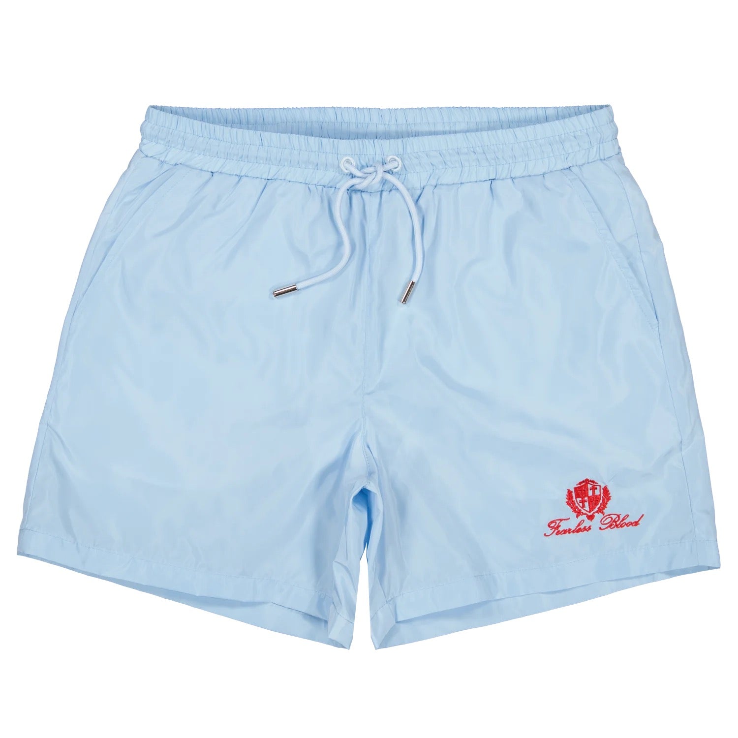 Korte broek met elastische tailleband en verstelbaar trekkoord. Twee zijzakken en een achterzak met rits voor extra veiligheid. De broek heeft een lichtblauwe kleur en is bedrukt met een opvallend rood logo op de voorzijde. Subtiele stiksels en een gladde afwerking zorgen voor een strakke uitstraling. Geschikt voor dagelijks gebruik of sportieve activiteiten.