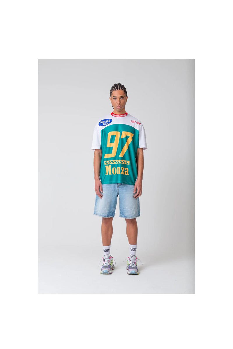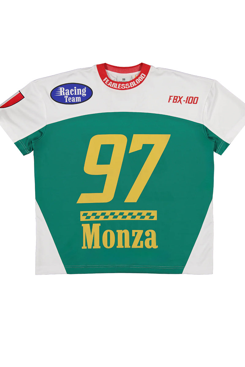 Dit T-shirt heeft een opvallend racing design met een groot '97' op de voorkant en de tekst 'Monza' daaronder, beide in geel. De achterkant bevat eveneens het nummer '97' met daaronder het merklogo in blauw. Voorzien van een ronde hals met een contrasterende rode boord, waarop 'FEARLESS BLOOD' in het wit is gedrukt. De korte mouwen zijn wit met groene accenten op de zijkant en schouders. De voorzijde heeft een 'Racing Team' logo op de borst. Het T-shirt past goed in de categorieën T-shirt, Shop, T-shirts & Polo's, Brands, FEARLESS BLOOD.