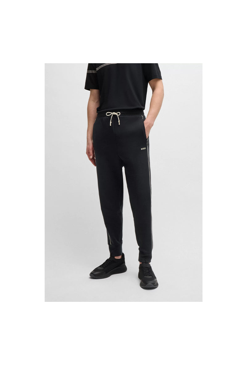 Jogging broek met een moderne snit en elastische tailleband met trekkoord. Tweezijdige zakken en boord aan de enkels voor optimale pasvorm. Het contraststreep detail langs de zijkanten voegt visueel dynamiek toe, terwijl het subtiele BOSS-logo op het linkerbeen voor merkherkenning zorgt.