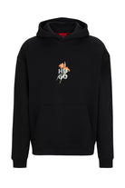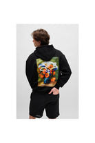 Sweater in een relaxte pasvorm met moderne zwarttint. Voorzien van een unieke opdruk van bloemen op de borst en een opvallende print op de rug. De trui is uitgerust met een capuchon en heeft een klassieke kangoeroezak aan de voorzijde voor praktische opbergruimte. Ribgebreide boorden bieden extra structuur aan de mouwen en zoom. Zonder zichtbare logo's integreert dit model subtiel moderne kunst in hedendaagse mode.