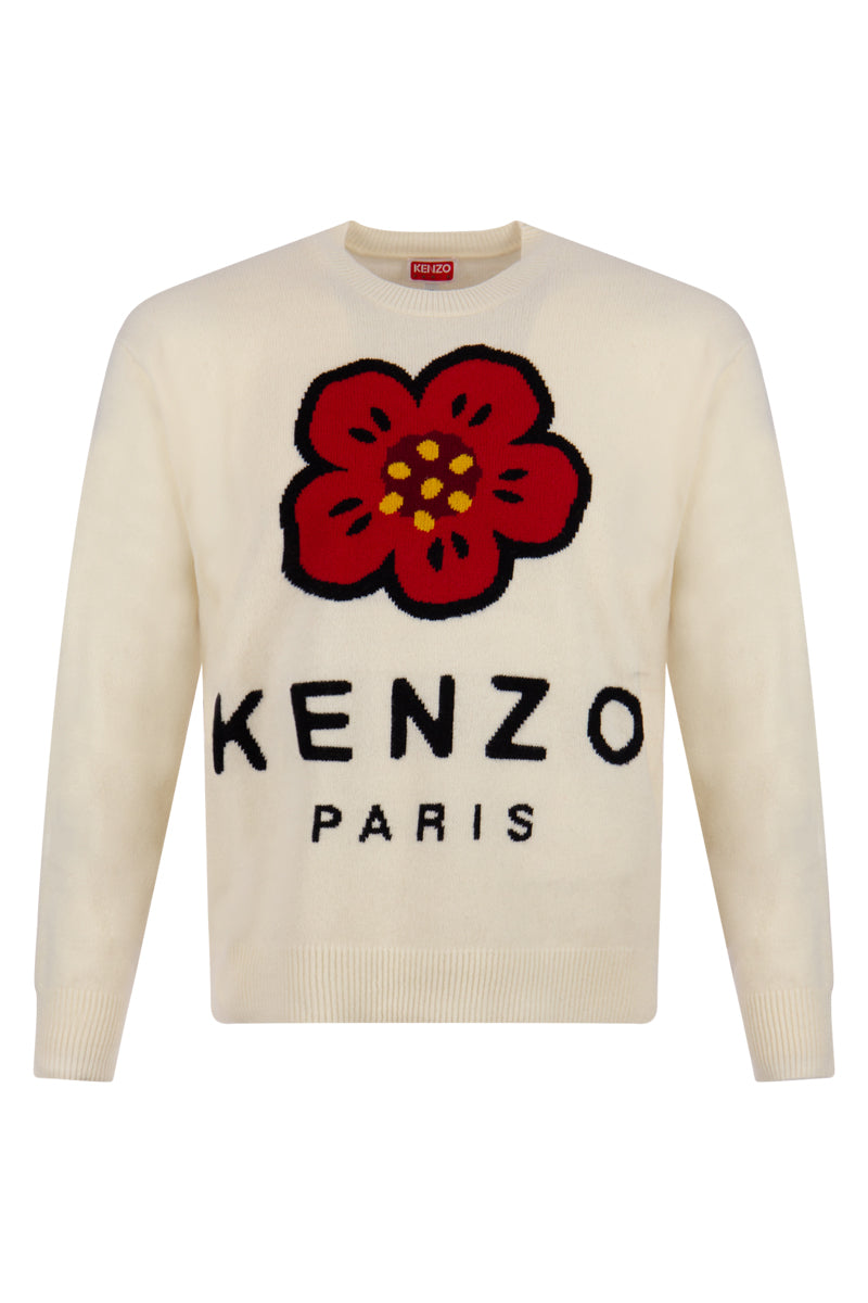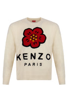 Deze 02 off white gekleurde trui is van het merk Kenzo. De trui heeft een Classic Fit pasvorm en heeft een grote Boke bloem op de voorzijde, waar het Kenzo Paris logo onder staat.