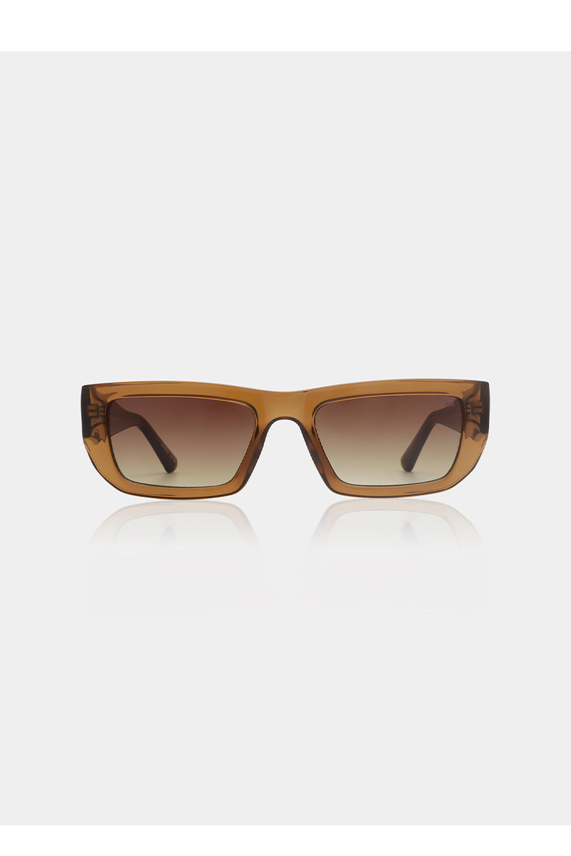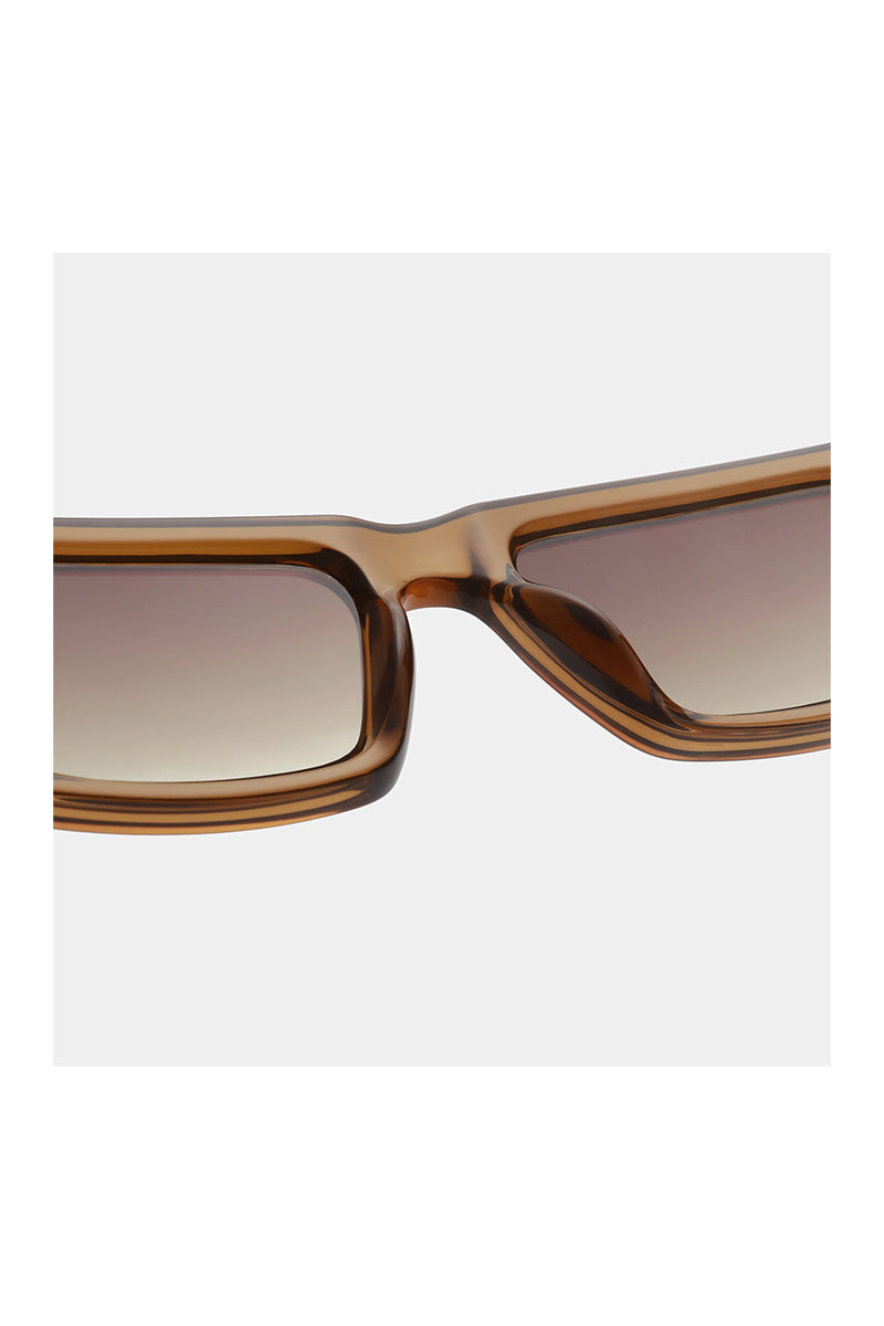 Rechthoekige zonnebril met een eigentijds ontwerp. Voorzien van een stevig montuur met een gladde, gepolijste afwerking. Gradient lenzen voor een subtiele overgang in tinten. Discreet logo op de linker poot. Geschikt voor dagelijks gebruik. Beschikt over smalle poten met een lichte kromming achter de oren voor een betere pasvorm.