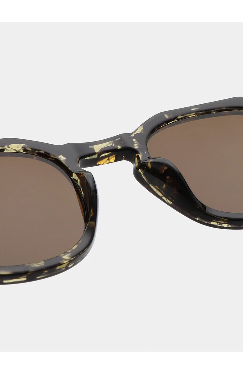 Stijlvolle zonnebril van het merk A. KJAERBEDE. Het montuur heeft een uitgesproken ontwerp met een gecombineerde geel en zwarte schildpaddenkleurige print. De glazen bieden UV400-bescherming en zijn bruin getint, wat zorgt voor helder zicht en bescherming tegen zonlicht.