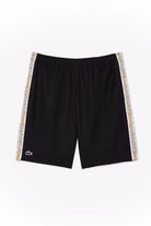 Kort model met elastische tailleband. Twee zijzakken. Merklogo op de linkerpijp. Contrasterende strepen met merknaam langs de zijkanten.