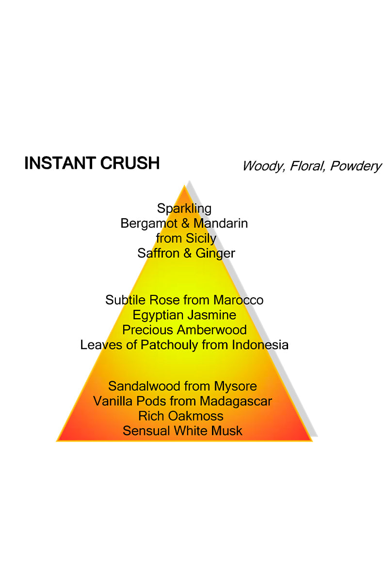 Eau de Parfum in een goudkleurige flacon. Subtiele balans tussen houtachtige, bloemige en poederachtige tonen. Topnoten van bergamot en mandarijn uit Sicilië, saffraan en gember. Hartnoten van Marokkaanse roos, Egyptische jasmijn, kostbaar amberhout en patchoelibladeren uit Indonesië. Basisnoten van sandelhout uit Mysore, vanillepeulen uit Madagaskar, rijk eikenmos en sensuele witte musk.