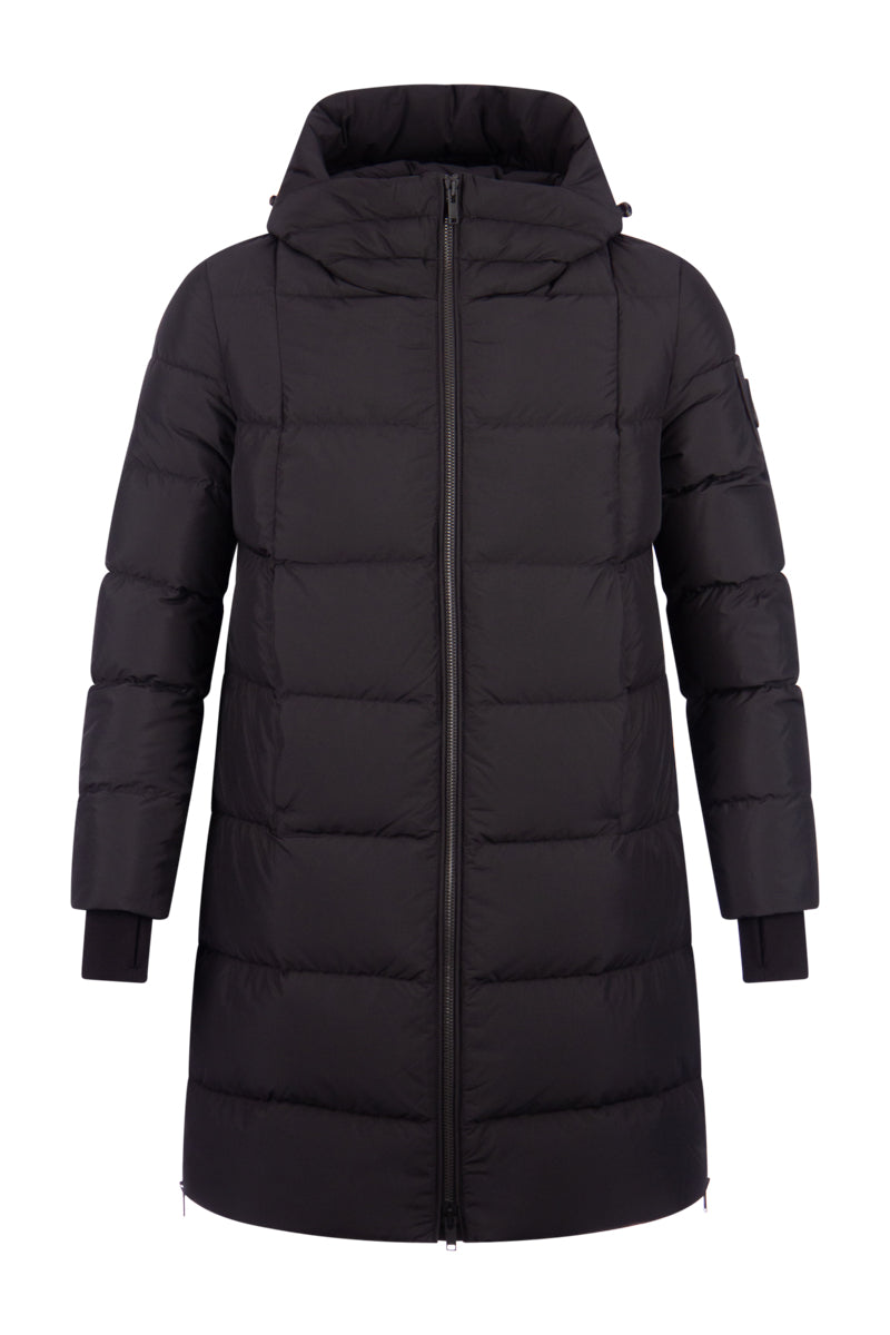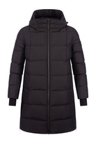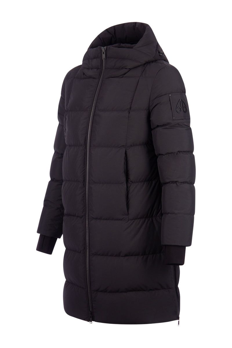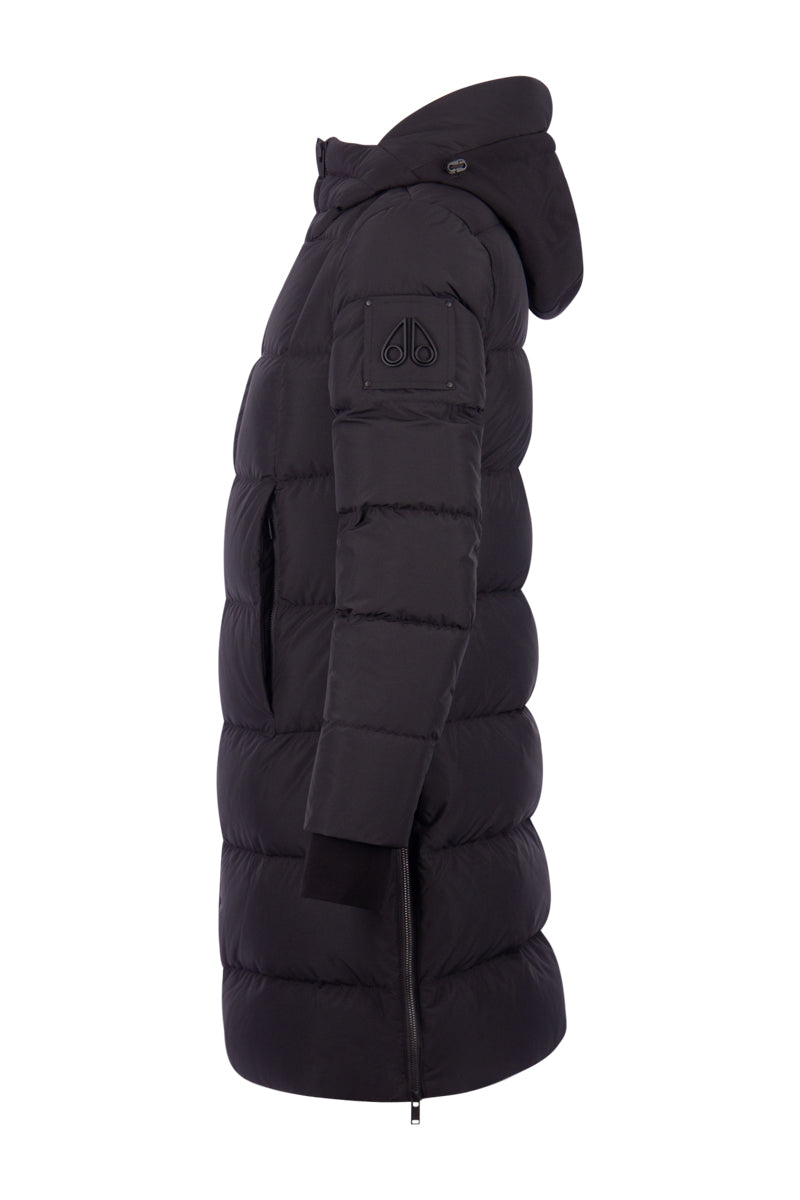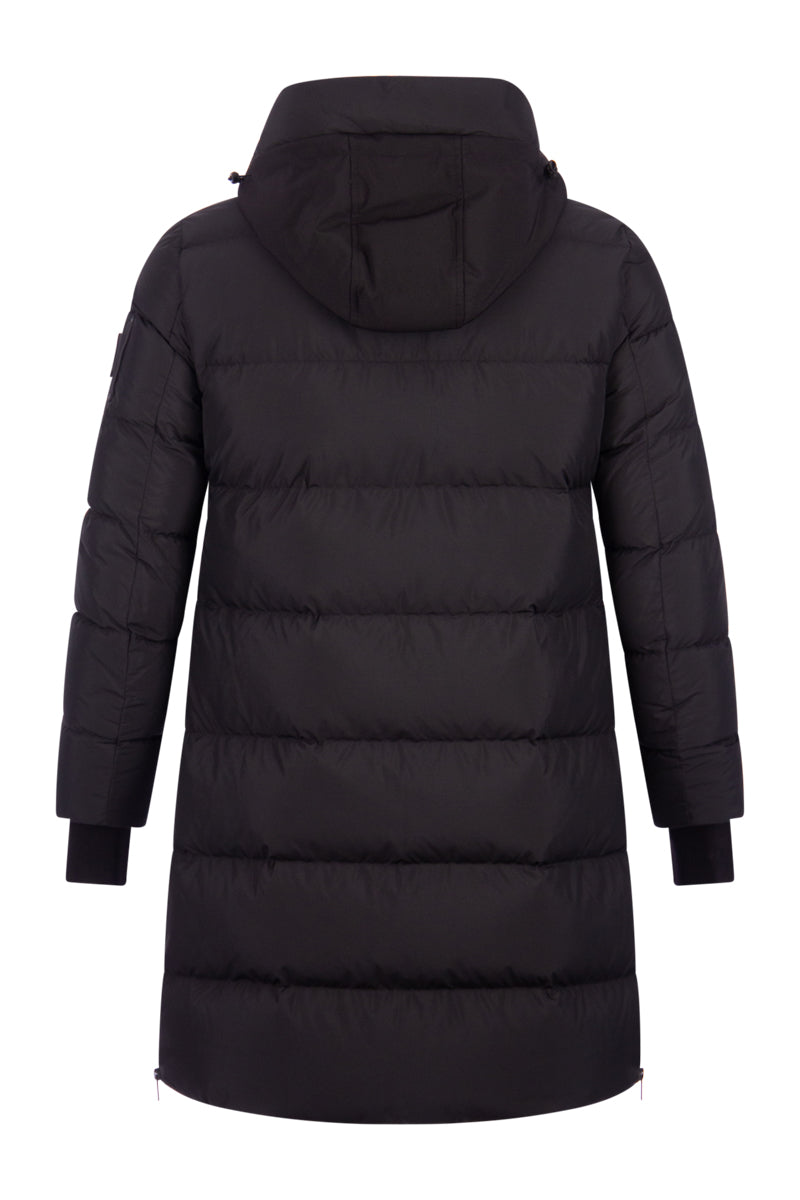 Deze "Saulteaux jacket W" in de kleur 929 black is van het merk Moose Knuckles. De jas heeft een Slim Fit pasvorm en komt tot de knie. De Saulteaux jacket heeft twee zakken op de voorzijde en een rits op de zijkant die tot voorbij de heup komt. Aan het einde van de mouw zitten stormmanchetten met een gat voor de duim. Het iconische Moose Knuckles zit op de linker mouw.