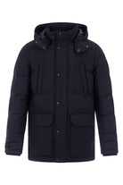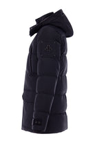 Zwarte jas van Moose Knuckles met gewatteerde structuur en vaste capuchon. Voorzien van twee voorzakken met klep en drukknoopsluiting, evenals twee borstzakken met rits. De jas heeft een ritssluiting met drukknopen aan de voorzijde voor extra bescherming. Verstelbare manchetten voor een nauwsluitende pasvorm. Subtiel logo op de mouw.