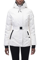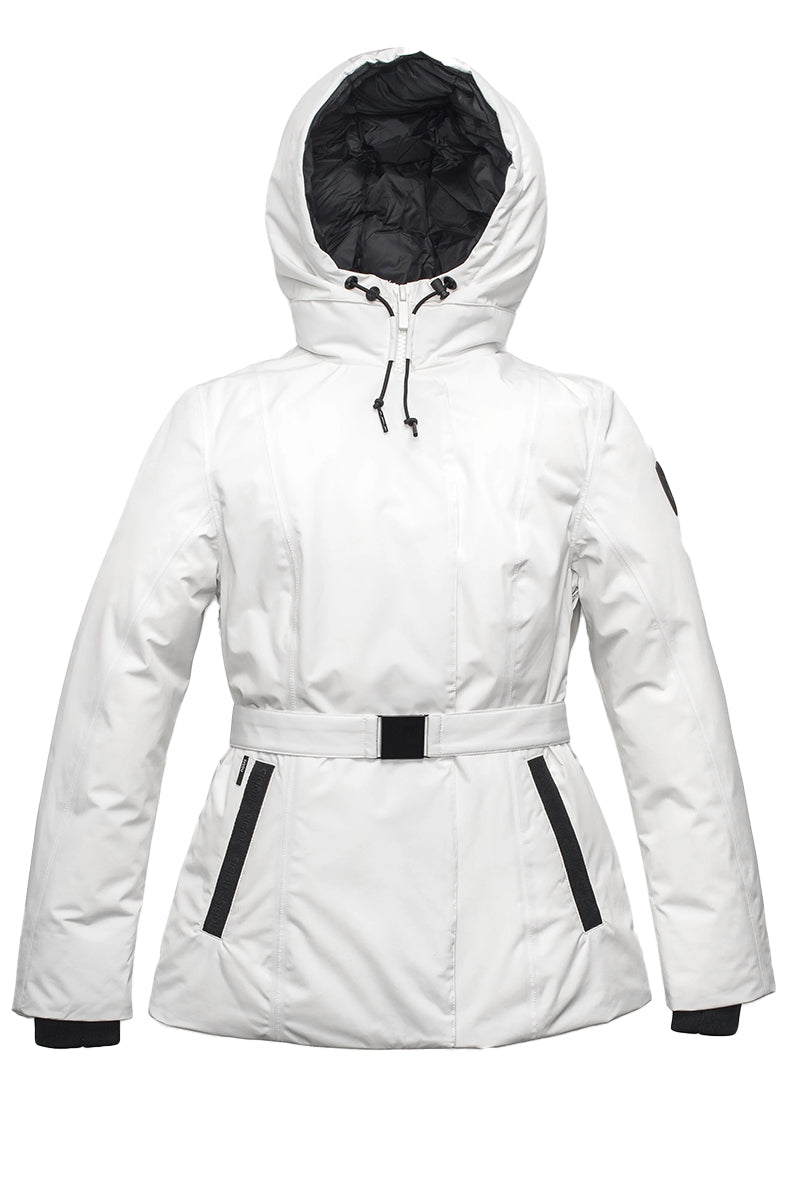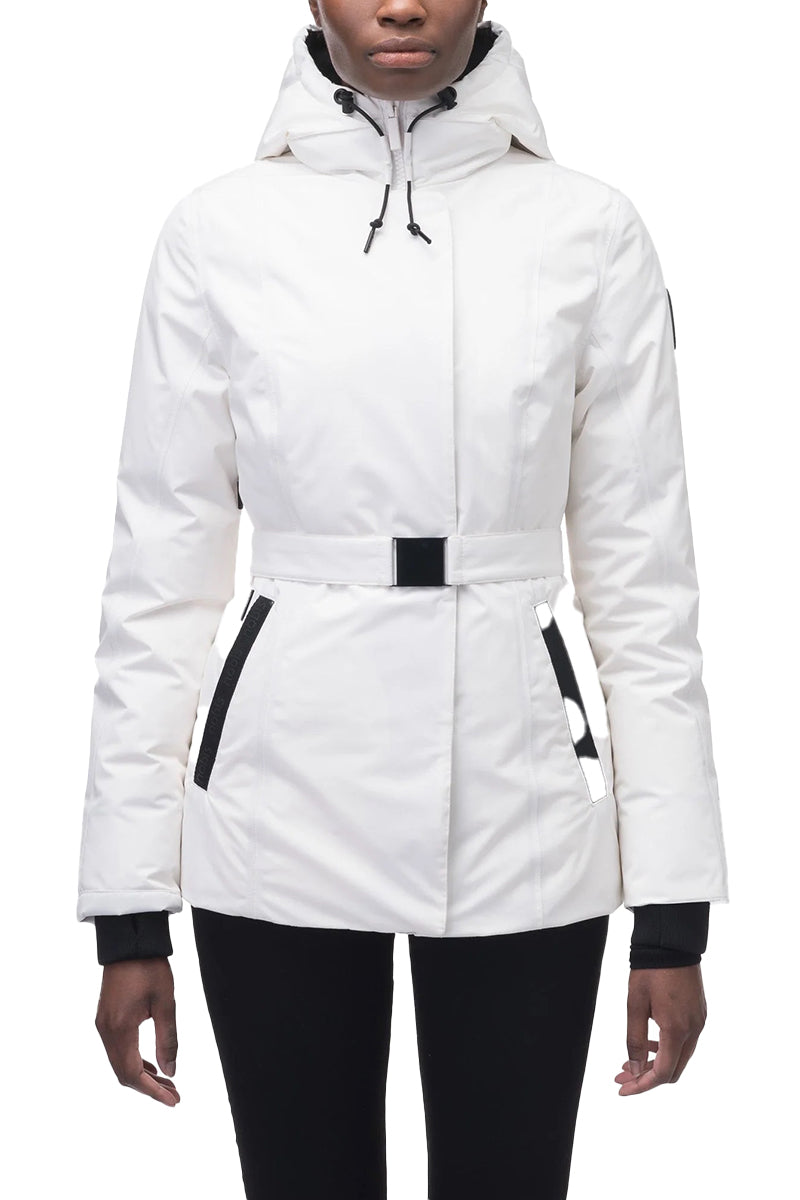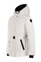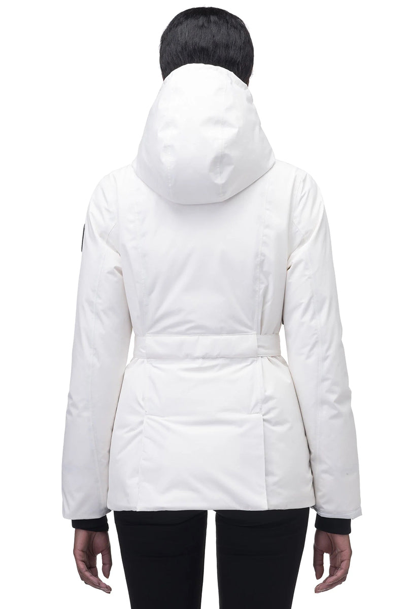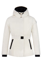 Dames hip-length Nobis parka, Shaw, in de kleur chalk/off-white. De tijdloze vrouwen parka is voorzien van een riem om de middel, comfortabele capuchon en het iconische Nobis logo op de mouw. Tot slot is de jas gevuld met dons voor warmte tegen extreme kou.