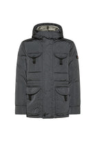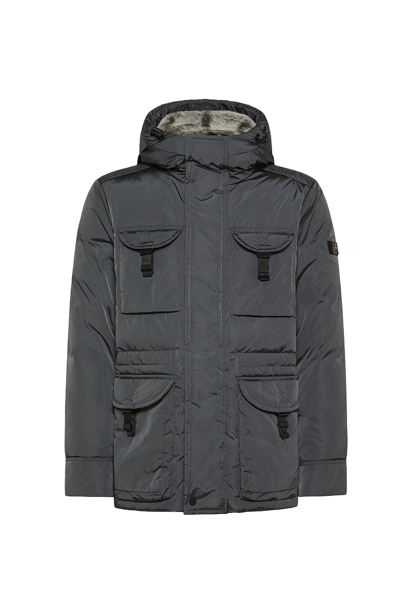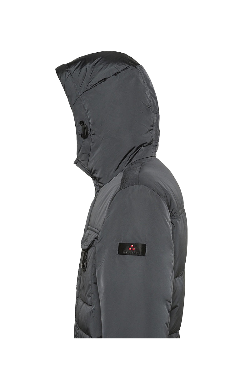 Functionele winterjas met afneembare capuchon. Verstelbare taille voor een gepersonaliseerde pasvorm. Dankzij de dubbele rits- en drukknoopsluiting biedt het extra bescherming tegen weersinvloeden. Twee borstzakken met klepsluiting en vier zakken aan de voorzijde zorgen voor praktische opbergmogelijkheid. De jas is voorzien van een subtiel Peuterey-logo op de mouw.