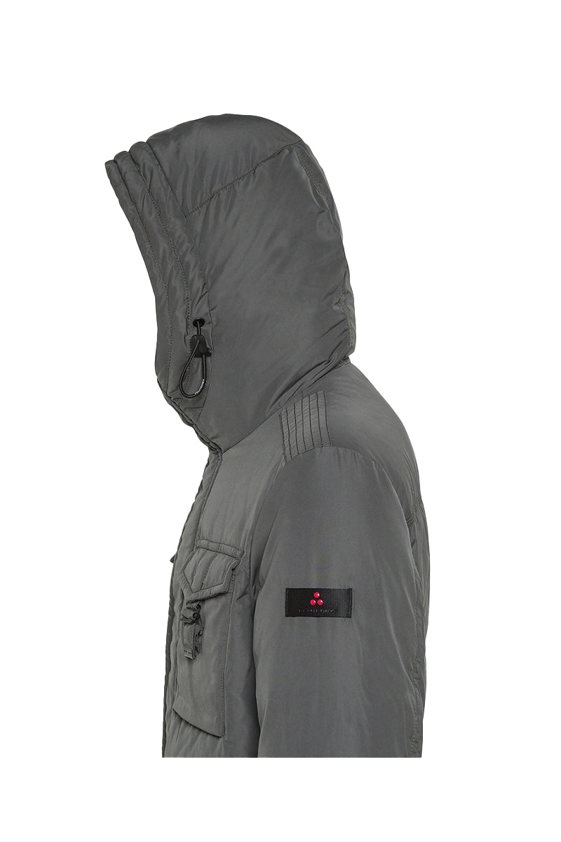 Functionele jas met opstaande kraag en vaste capuchon. Rechte pasvorm. Voorzien van vier zakken met klep aan de voorzijde. Dubbele sluiting: rits en drukknopen. Subtiel logo op de linkermouw. Verstelbare manchetten voor een nauwsluitende pasvorm.
