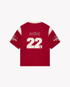 Het Saint Blanc T-SHIRT COLLECTIVE JERSEY ROOD is een opvallend herenshirt van het merk Saint Blanc. Dit jersey-item heeft een sterke retro sportkledingstijl, met een verwijzing naar Amerikaanse sportkleding. Het design wordt gekenmerkt door de dieprode kleur en de contrasterende crème V-hals en schouderinzetstukken. Centraal staat de prominente, witte opdruk van het rugnummer ‘22’ op zowel de borst als de achterzijde.