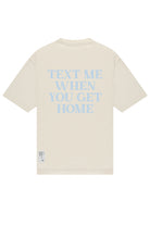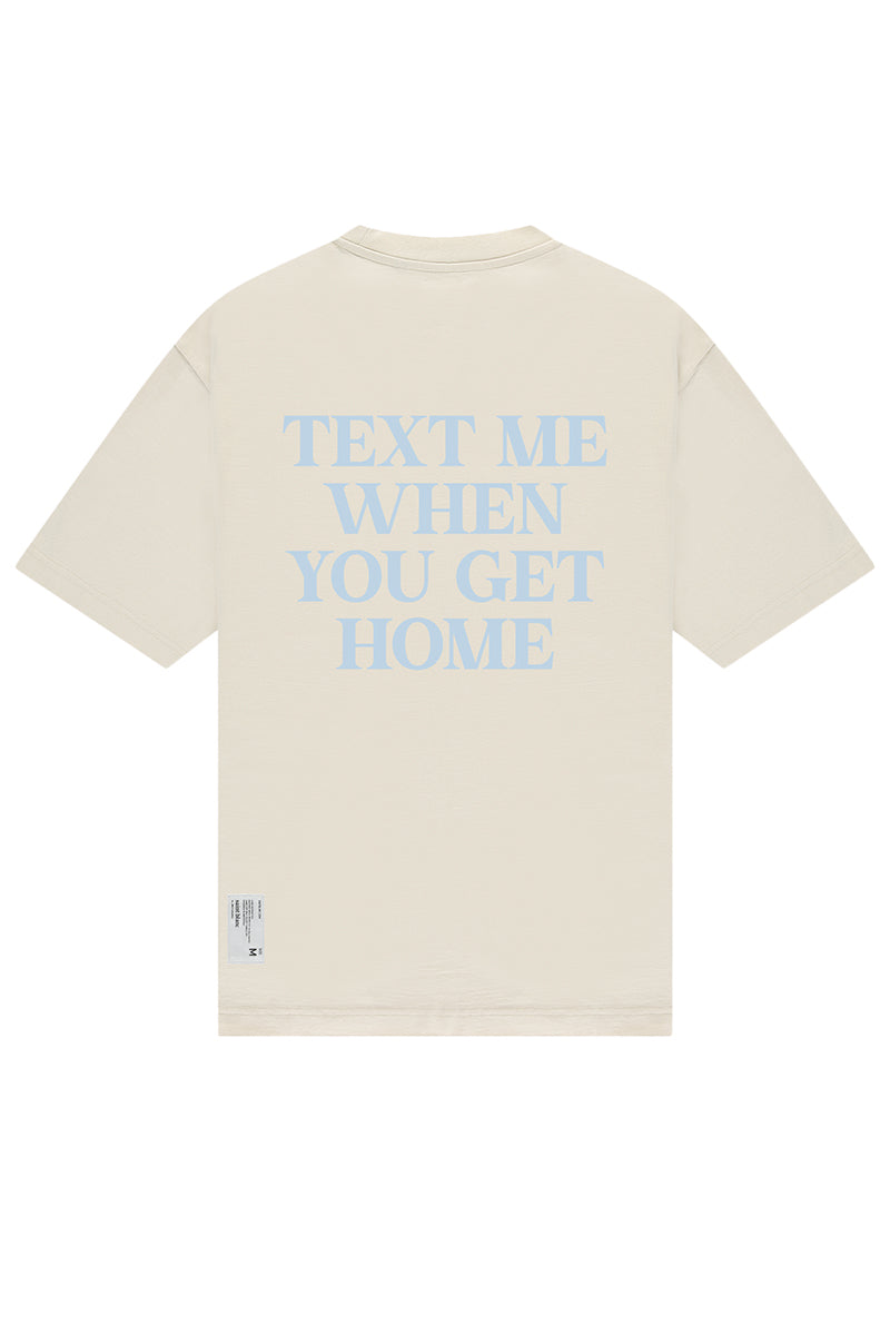 Klassiek T-shirt met rechte pasvorm. Voorzien van een ronde hals en korte mouwen. Achterzijde bedrukt met de tekst “Text Me When You Get Home” in lichte kleurstelling. Klein geborduurd “saint blanc” logo op de borst. Ontworpen voor dagelijks gebruik.