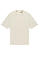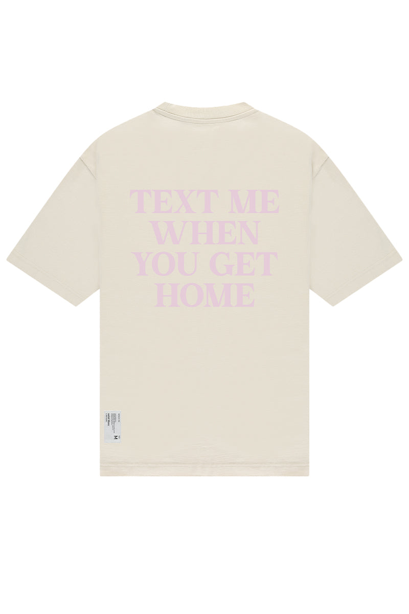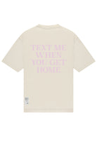 T-shirt in een losse pasvorm. Klassieke ronde hals en korte mouwen. De achterkant bevat een statement opdruk met de tekst "TEXT ME WHEN YOU GET HOME" in lichte lila tint. Het subtiele merklogo van Saint Blanc is op de borst gedrukt.
