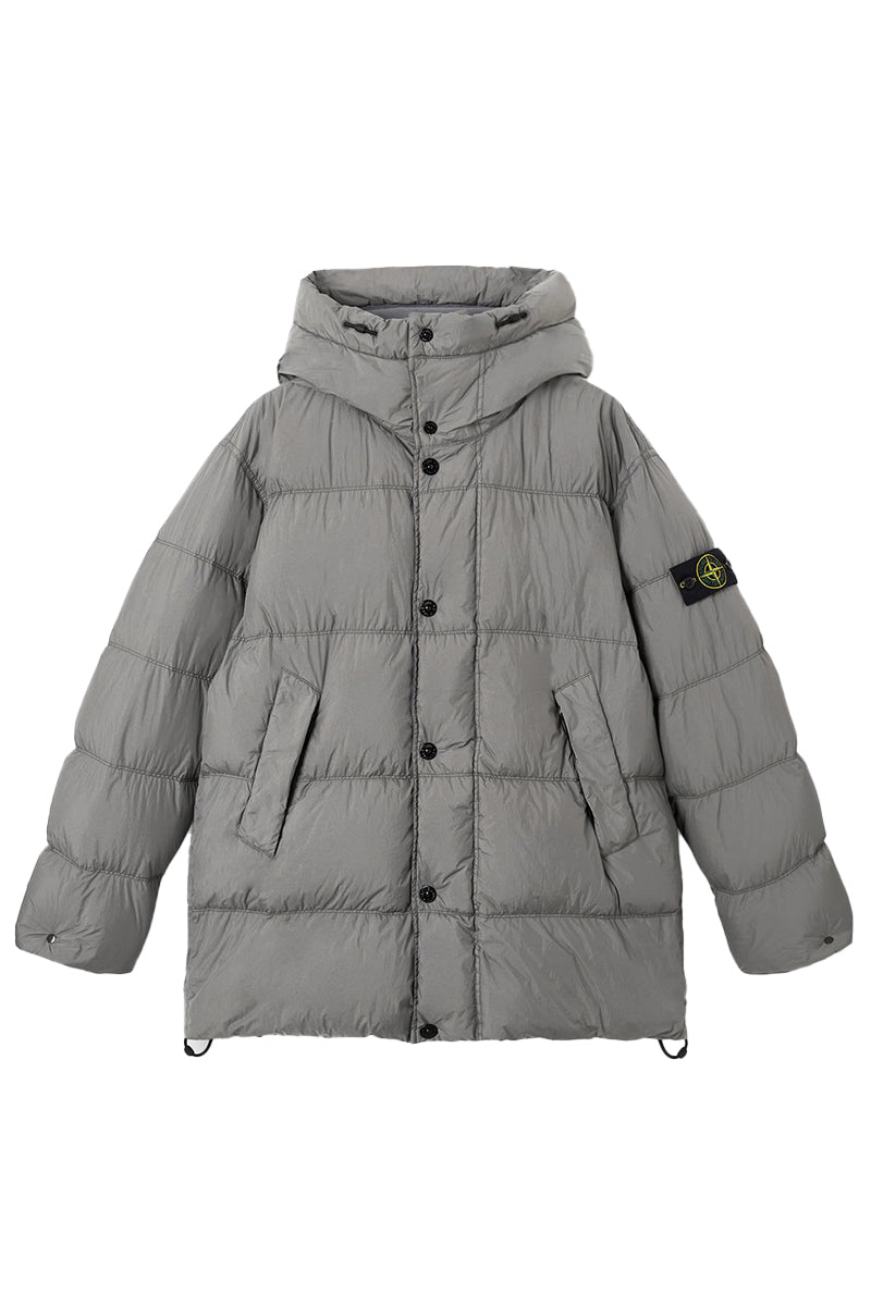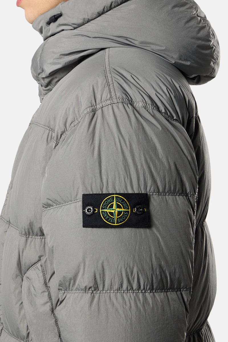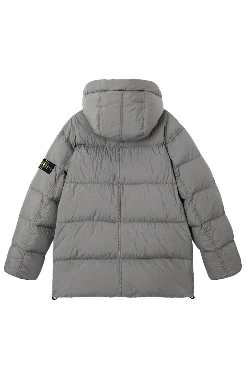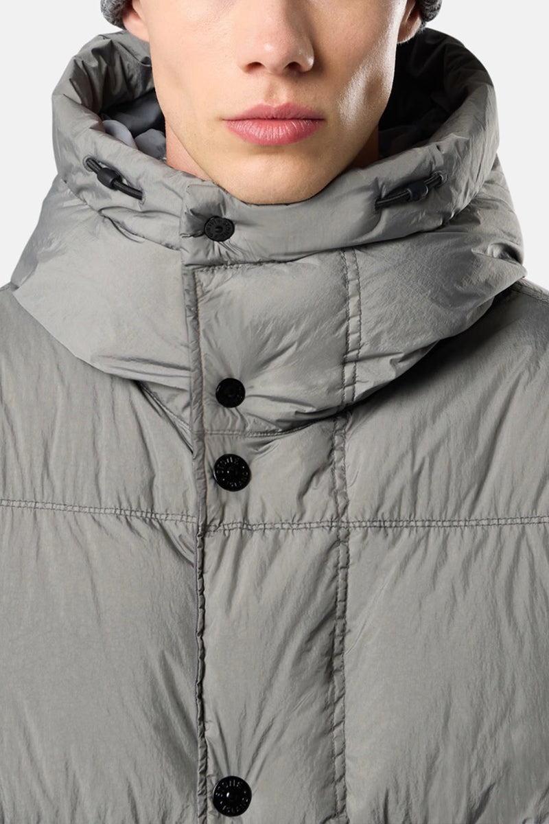 Deze jas van Stone Island is ontworpen met functionaliteit en stijl in gedachten. Het model is uitgevoerd in een grijze kleur en voorzien van een gewatteerde structuur, die zorgt voor extra isolatie. De jas sluit met zwarte knopen aan de voorkant en heeft een ruime capuchon voor bescherming tegen de elementen. Op de linkermouw bevindt zich het iconische Stone Island logo. De jas beschikt over twee schuine zakken aan de voorkant, ideaal voor het opbergen van kleine items. Het is een veelzijdig stuk dat makkelijk gecombineerd kan worden met verschillende stijlen.