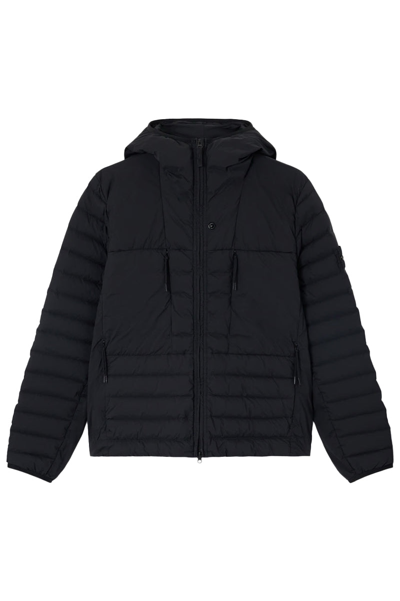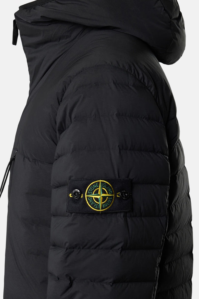 De Stone Island jas is vervaardigd in zwart met een gestroomlijnd design. Uitgerust met een middelzware stof biedt de jas goede isolatie en bescherming tegen het weer. Het model heeft een gewatteerde structuur met horizontale stiksels en een vaste capuchon voor extra bescherming. Praktische zakken met ritssluiting aan de voorzijde zorgen voor voldoende opbergruimte. Op de linkerarm bevindt zich het iconische, afneembare Stone Island logo, wat de jas een herkenbaar uitstralingselement geeft.