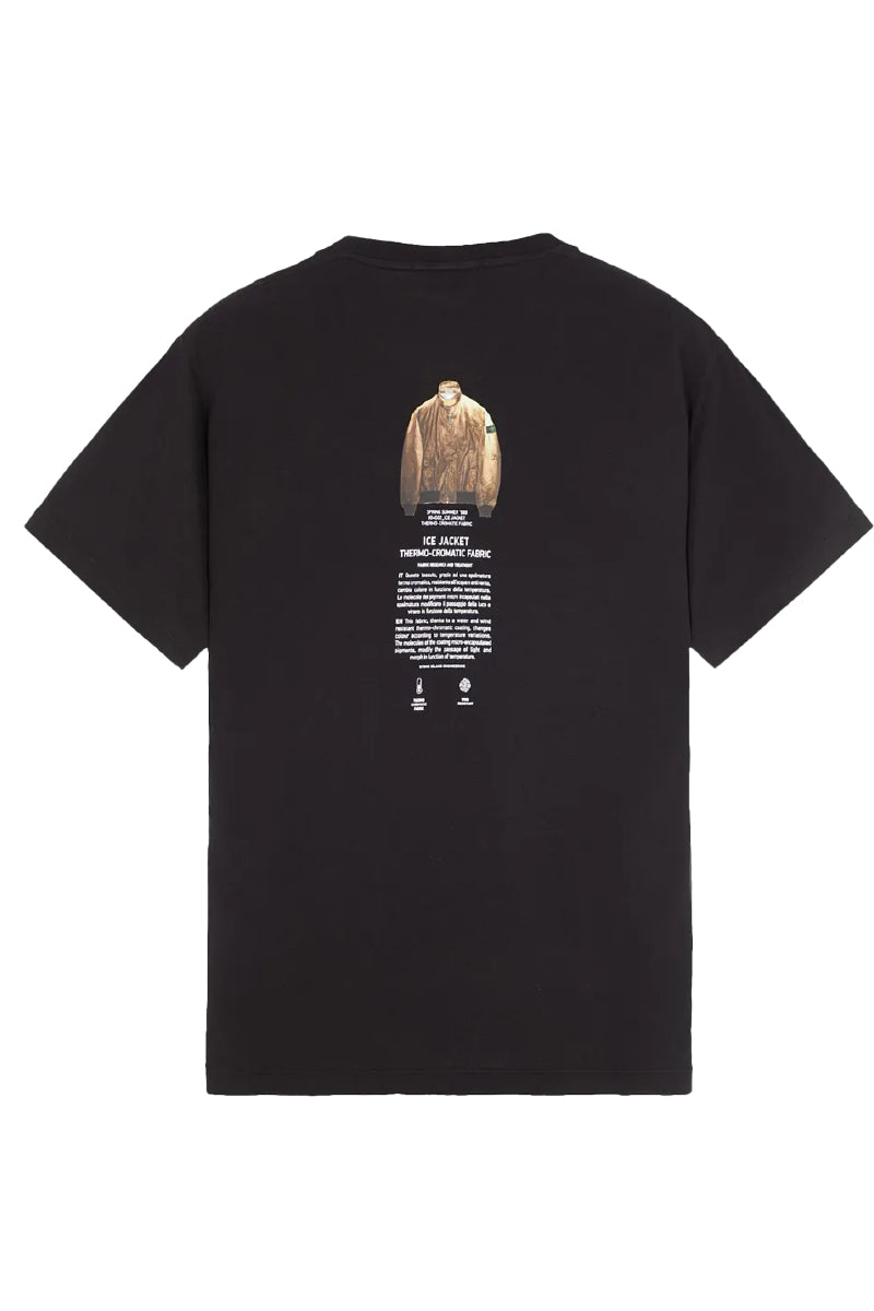 Zwart T-shirt met korte mouwen en een rechte pasvorm. Voorzien van een ronde hals. Op de borst subtiele opdruk van het Stone Island logo. Achterzijde voorzien van gedetailleerde grafische print met thematische elementen. Geschikt voor dagelijks gebruik.