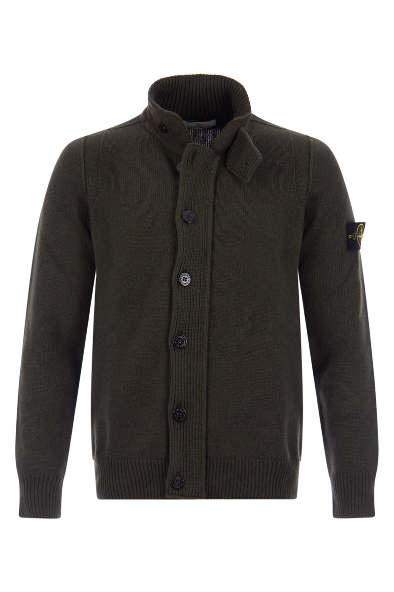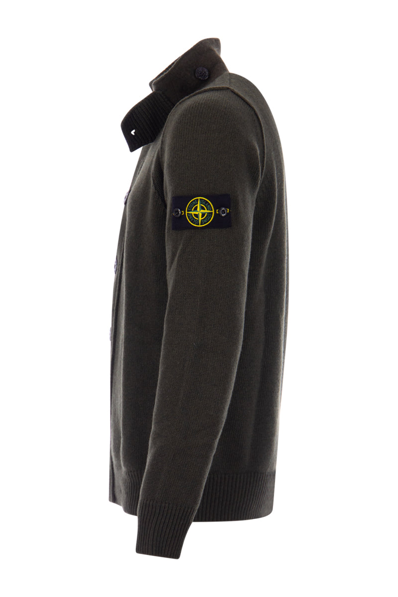 De STONE ISLAND TRUI 7915547A3 is een essentiële toevoeging aan uw collectie, gemaakt van een hoogwaardige mix van wol en polyamide. Dit Regular Fit model in D-groen onderscheidt zich door de opstaande kraag met extra sluiting en de volledige knoopsluiting aan de voorzijde. De iconische Stone Island badge is subtiel doch duidelijk geplaatst op de linkermouw. Deze trui biedt een verfijnde, robuuste uitstraling en optimaal draagcomfort voor de koudere dagen.
