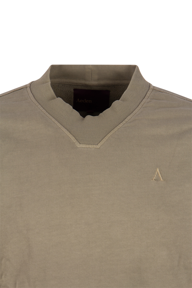 Deze taupe gekleurde "Dawson" sweater is van het merk Aeden. De sweater heeft een klein opstaand kraagje en heeft het Aeden logo op de rug staan. Op de borst zit nog een klein logo.