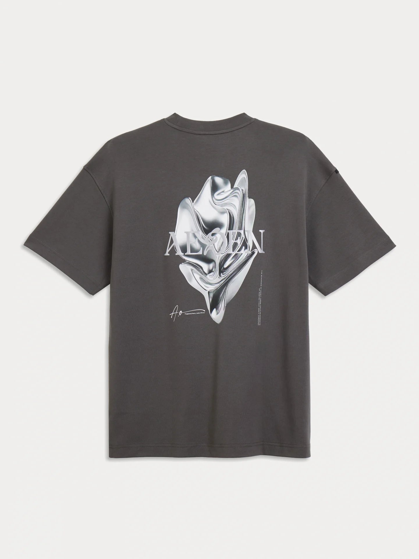 Dit T-shirt van AEDEN heeft een moderne uitstraling dankzij de donkere grijze kleur en het unieke design. Het design is voorzien van een opvallende opdruk op de achterkant, met verfijnde grafische elementen en het merklogo. De pasvorm is standaard en biedt een comfortabele ervaring voor dagelijks gebruik. De ronde halslijn en korte mouwen maken het item veelzijdig, geschikt voor diverse gelegenheden en combinaties. Deze kenmerken dragen bij aan een eigentijdse en stijlvolle look.