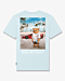 Rondnekkig T-shirt met korte mouwen. Voorzijde subtiel merklogo, achterzijde opvallende posterprint met strandthema. Vrije, comfortabele pasvorm. Perfect te combineren met casual broeken. Kleur: lichtblauw.