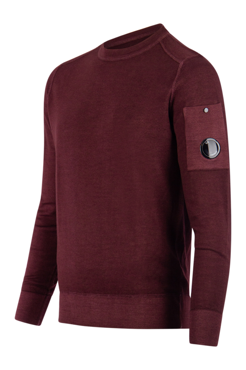 Heren fast dyded sweater, 13CMKN245A, in de kelur bordeaux-rood. Van het merk C.P. Company. De comfortabele trui is voorzien van een zakje op de arm met daarop de iconische C.P. Company lens.