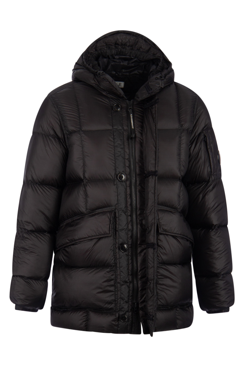 Deze "OUTHERWEAR LONG JACKET DD SHELL" in de kleur zwart is van het met C.P. Company. De winterjas heeft een Regular Fit pasvorm en komt ongeveer tot de heup. Deze C.P. Company jas heeft een volledige rits, die nog afsluitbaar is met een rij knopen. De capuchon is afneembaar en de iconische lens met het logo van C.P. Company zit op de linker mouw.